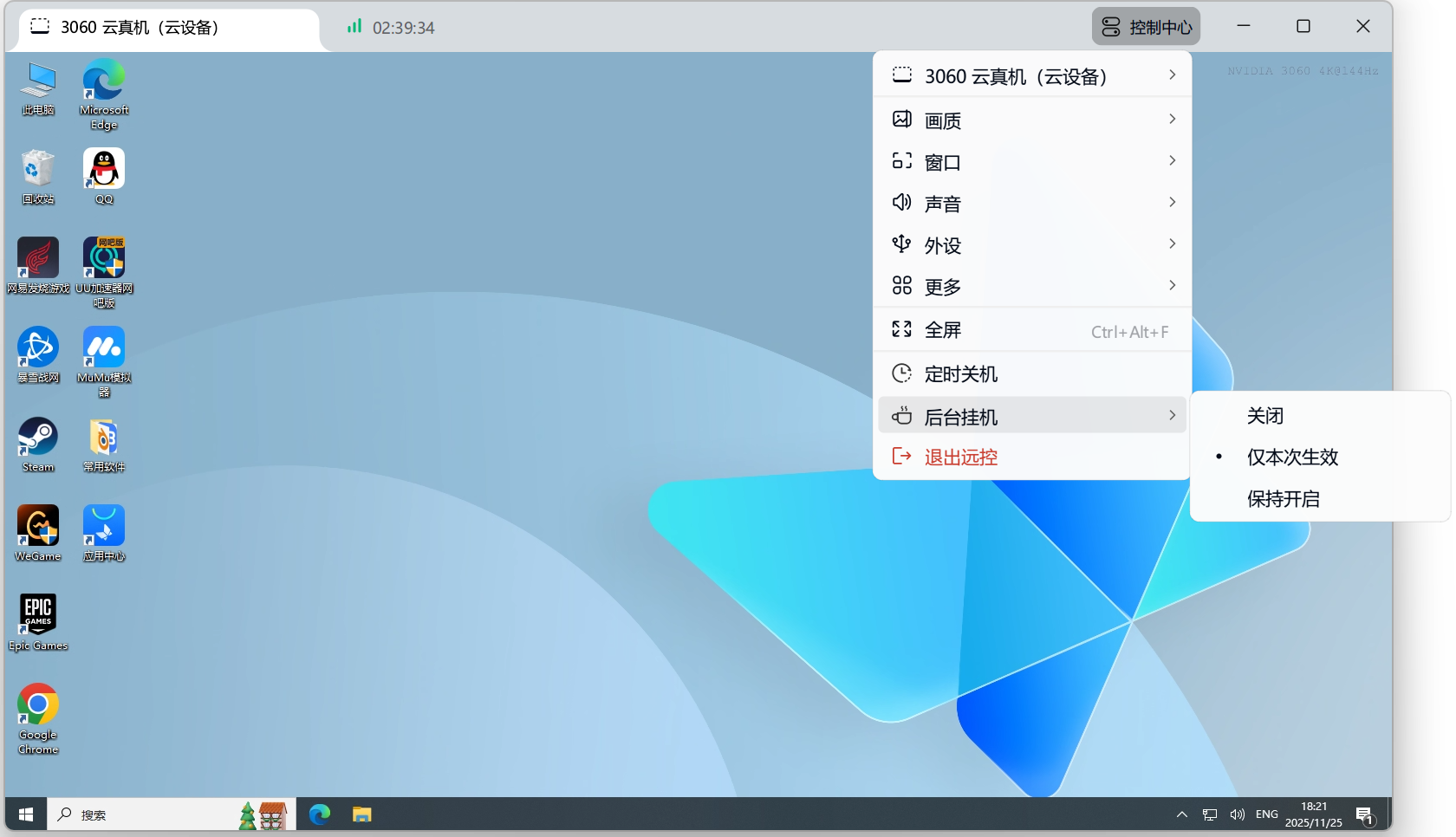 - [仅本次生效]即仅本次退出云电脑控制后,云电脑保持后台运行;
