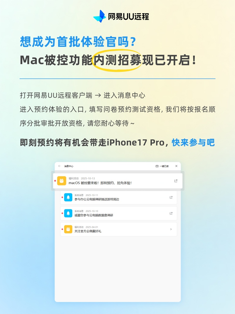 打开网易UU远程客户端 →进入消息中心,进入预约体验的入口,填写问卷预约测试资格,我们将按报名顺序分批审批开放资格,请您耐心等待~