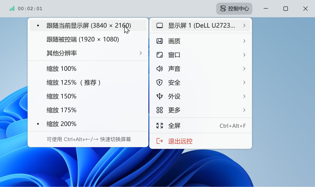 进入远程桌面后,单击右上角[控制中心]即可展开功能菜单,用于配置远程连接中的功能,包括[分辨率]、[画质]、[窗口]、[声音]、[安全]等。