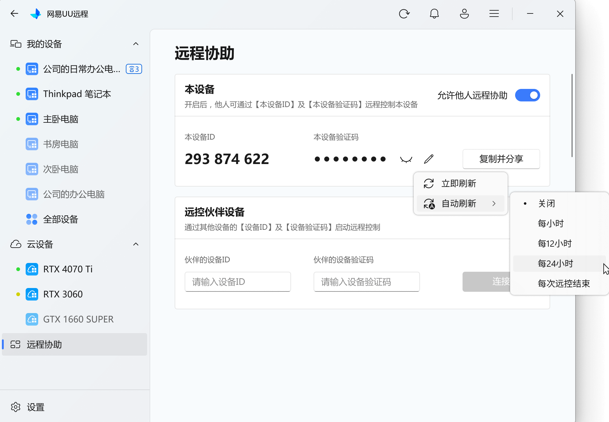 被控端 Windows 设备新增自定义验证码刷新策略,如果需要固定验证码,可以关闭刷新功能,每次进行手动刷新。